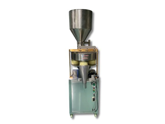 Nguyên lý hoạt động của máy rất trực quan: cốc đong có thể tích cố định được lấp đầy nguyên liệu từ phễu chứa phía trên, sau đó xả thẳng vào túi bao bì bên dưới. Mỗi lần kích hoạt bằng bàn đạp pedal, máy thực hiện đúng một chu trình nạp – xả. Nhanh. Gọn. Không rườm rà.